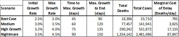 The results of four scenario calculations are shown in the table below. what we find from these results if that under cases of larger growth rates and delayed control of the epidemic, hundreds of thousands of people may die, and that every day of delay in aggressively controlling the epidemic will result in thousands of additional deaths. The details of these calculations are in the technical note linked to at the top of this page.