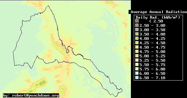 Solar resource assessment is a fairly straightforward application of remote sensing analysis. Cloud reflectance is detected in visible band satellite images, and the comparison of clear sky images and images with clouds can be used to estimate the approximate fraction of radiation reflected by clouds. The remaining radiation is assumed to reach the ground. With a fairly small sampling of stations a correlation relationship is derived between the measured solar radiation and the satellite-based cloud reflectance. We then use this relationship to estimate solar radiation for all of Eritrea and the surrounding area.