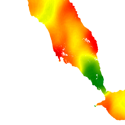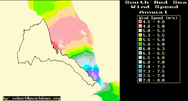The scatterometry data shows the jet-like shape of the high wind region with greater definition. The high winds in the Red Sea near Aseb are produced by the acceleration of the air in the lower marine layer as it flows from the Gulf of Aden to the Red Sea. This jet is at its strongest in the late afternoon and evening, and is at its weakest in the early morning. The strongest part of the jet extends from near the Djibouti border north to the waters just off of Idi, but it weakens as one proceeds from Idi to Tio. Proceeding North, the Massawa area is in a fairly low wind area of the coast with winds still fairly low as on proceeds north, but the winds intensify near the Sudanese border and the area around Port Sudan.